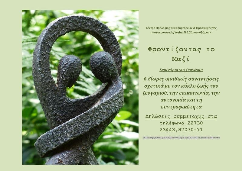 Το Κέντρο Πρόληψης Π.Ε. Σάμου 'Φάρος' πρόκειται να υλοποιήσει βιωματικές συναντήσεις για ζευγάρια σε θέματα σχετικά με τον κύκλο ζωής του ζευγαριού, την επικοινωνία, την αυτονομία και τη συντροφικότητα.