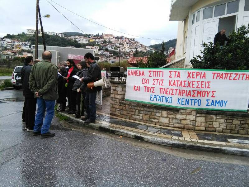 Πραγματοποιήθηκε σήμερα, από μέλη του Εργατικού Κέντρου και των σωματείων, την ΠΑΣΕΒΕ και τους γυναικείους Συλλόγους μέλη της ΟΓΕ, παράσταση διαμαρτυρίας ενάντια στις κατασχέσεις και τους πλειστηριασμούς, στην Εφορία της Σάμου.