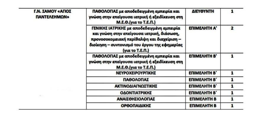 Η προκήρυξη αφορά στην επί θητεία θέσεων ειδικευμένων ιατρών κλάδου ΕΣΥ Νοσοκομείων και Κέντρων Υγείας. Σύμφωνα με την ενημέρωση που απέστειλε στο γραφείο του Βουλευτή το Γραφείο Τύπου του Υπουργείου Υγείας, για το νομό Σάμου, οι θέσεις είναι οι ακόλουθες: