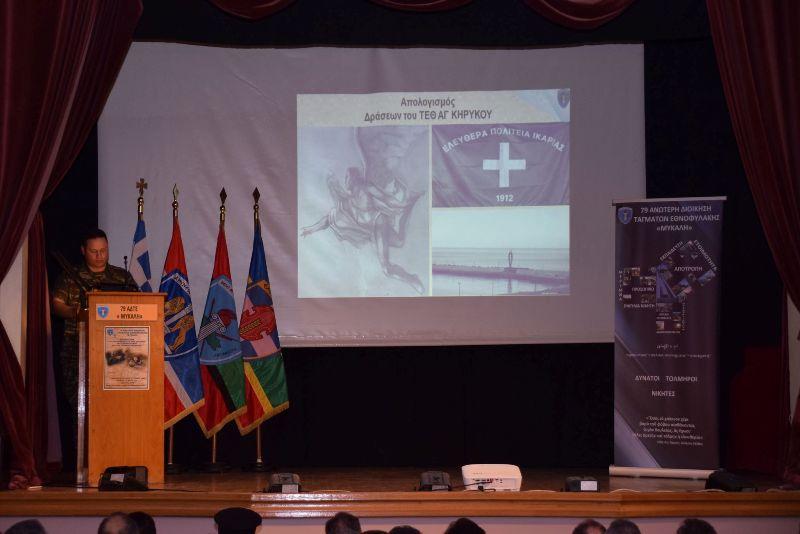 Η διάλεξη του Ανχη(ΠΖ) Νικόλαου Μπιτσάκου, διοικητή ΤΕΘ ΑΓ.ΚΗΡΥΚΟΥ, αφορούσε το νησί της Ικαρίας και τις δράσεις που πραγματοποίησαν οι Εθνοφύλακες του νησιού.
