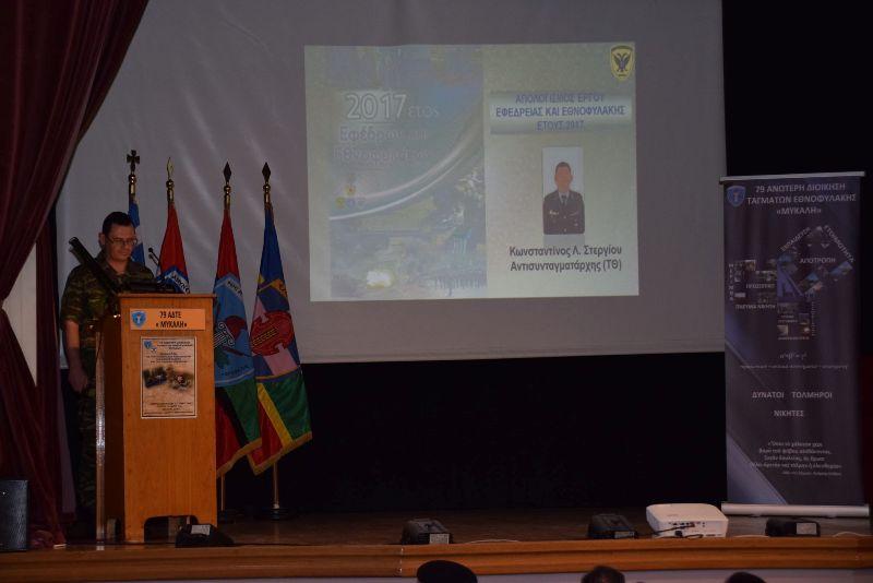 Οι ομιλίες έκλεισαν με τον Ανχη(ΜΧ) Ιωάννη Βελεγράκη, διοικητή ΤΕΘ ΣΑΜΟΥ με τον απολογισμό των δράσεων και τον προγραματισμό του τάγματος για το έτος 2018.