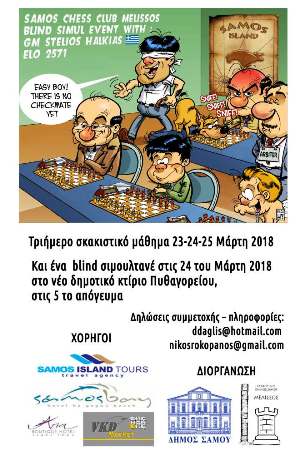 Το Σάββατο 24 Μαρτίου (17:00) θα διοργανωθεί αγώνας επίδειξης “τυφλού Σκάκι” στο Νέο Δημοτικό Κτίριο Πυθαγορείου. Είσοδος Ελεύθερη για όλους τους φίλους του αθλήματος. Την Παρασκευή 23 & την Κυριακή 25 Μαρτίου (17:00) στο χώρο του συλλόγου στο Βαθύ (Μανιάκειο Κτίριο- Πλησίον Νοσοκομείου) θα παραδοθεί σκακιστικό 4ωρο σεμινάριο. Για πληροφορίες και συμμετοχές παρακαλώ επικοινωνήστε μαζί μας στο Αυτή η διεύθυνση ηλεκτρονικού ταχυδρομείου προστατεύεται από τους αυτοματισμούς αποστολέων ανεπιθύμητων μηνυμάτων. Χρειάζεται να ενεργοποιήσετε τη JavaScript για να μπορέσετε να τη δείτε.