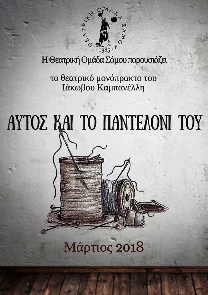 Από το Καρλόβασι ξεκινάει την τρίτη εφετεινή της παραγωγή η Θεατρική Ομάδα Σάμου. Είναι το μονόπρακτο του Ιάκωβου Καμπανέλλη "Αυτός και το παντελόνι του". Με αφορμή το ξηλωμένο παντελόνι του, ένας μοναχικός υπαλληλάκος βυθίζεται σε μνήμες με πρόσωπα που απουσιάζουν σωματικά αλλά επιβάλλουν έντονη την παρουσία τους. Στερημένος από αγάπη ξεσπάει σε γοερή έκκληση τρυφερότητας. Ρόλος ευλογία και πρόκληση για κάθε ηθοποιό στο κλασικό πλέον έργο του πρύτανη του νεοελληνικού θεάτρου. Παίζουν Αυτός: Κώστας Φώτεινας Α´Γυναίκα: Χριστίνα Χαρτζανιώτη Β´ Γυναίκα: Πόπη Αρμενάκη Σκηνοθετική επικουρία: Στέλιος Μάρκου Πρόγραμμα- Αφίσα: Βασίλης Τραπεζανλίδης, Πόπη Αρμενάκη