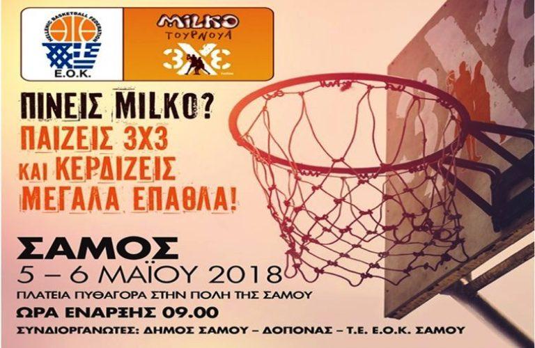 Ο Δήμος Σάμου και η ΤΕ ΕΟΚ Σάμου σε συνεργασία με την Ελληνική Ομοσπονδία Καλαθοσφαίρισης διοργανώνουν τουρνουά μπάσκετ Milko «3×3», στις 5 και 6 Μαΐου στη Πλατεία Πυθαγόρα της Πόλης Σάμου. Τις δυο μέρες αυτές η πλατεία της πόλης θα μετατραπεί σε γήπεδο μπάσκετ, όπου θα φιλοξενήσει παιδιά και εφήβους από ηλικίες 8 – 18 ετών που θα παίξουν σε ομάδες τριών ατόμων. Τα παιδιά που θα λάβουν μέρος θα επιβραβευθούν τόσο για την συμμετοχή όσο και για τις νίκες τους. Σκοπός αυτού του παιχνιδιού είναι να ενθαρρύνει τους νέους να ασχοληθούν με τον αθλητισμό και να πραγματώσουν τα όνειρα τους.